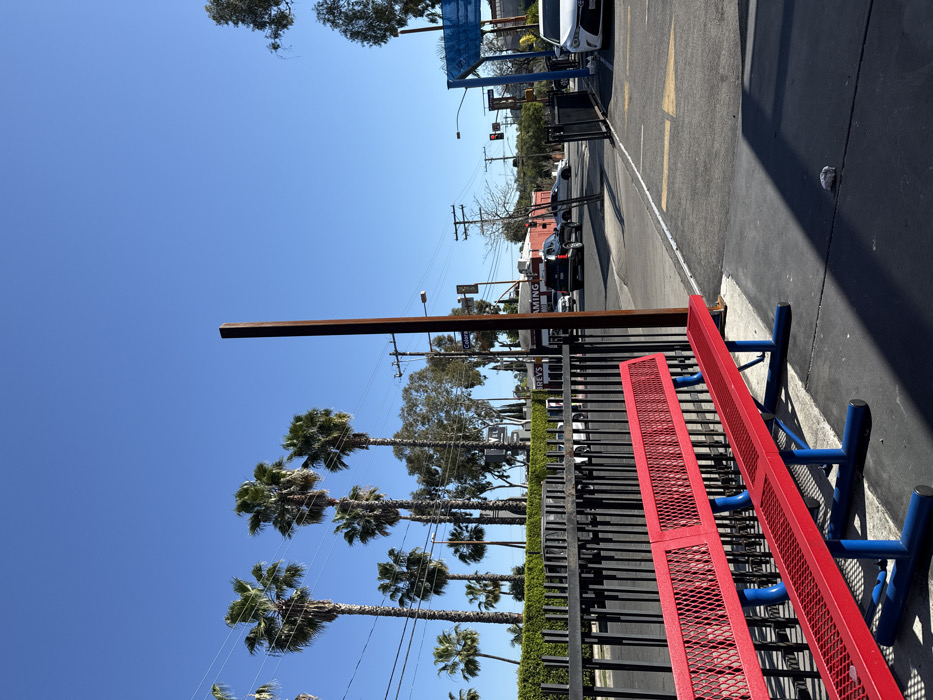 The image depicts an outdoor daytime scene on Colorado Street in Glendale, United States of America, under a clear blue sky. In the foreground, an empty bright red metal bench with blue support legs rests on a dark paved surface. A black metal fence separates this area from a street beyond. Shadows are cast on the pavement, indicating strong sunlight. In the midground, a street features several vehicles, including a dark SUV heading away from the viewer and a white sedan parked on the right. Street signs, one partially obscured but displaying "Colorado," and another indicating "Greys" and "Gaming," are visible. Numerous utility poles and power lines crisscross the scene. A tall, dark brown rectangular pole stands vertically near the center-right. Lush green hedges line the far side of the street. On the right, a blue awning structure is visible, partially obscuring a white vehicle. Traffic lights are present, one displaying a red signal. The background features multiple tall palm trees with green fronds against the clear blue sky. No individuals are present in the scene.