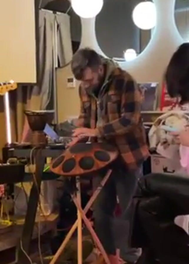 A band is performing indoors. One musician, wearing a brown and orange plaid shirt, plays a handpan atop a wooden stand. Another musician, wearing a green hooded sweatshirt, plays a keyboard on a stand to the left. A third band member, wearing a white shirt with a red pattern and a denim jacket, is seen in the background playing a bass guitar. There is a tall djembe behind the keyboard. To the right, a woman sits in a black leather chair, looking at her phone. The setting appears to be a cafe or bar with a projector screen, three round mirrors with lights, and other decor. Wires and equipment are visible around the musicians.