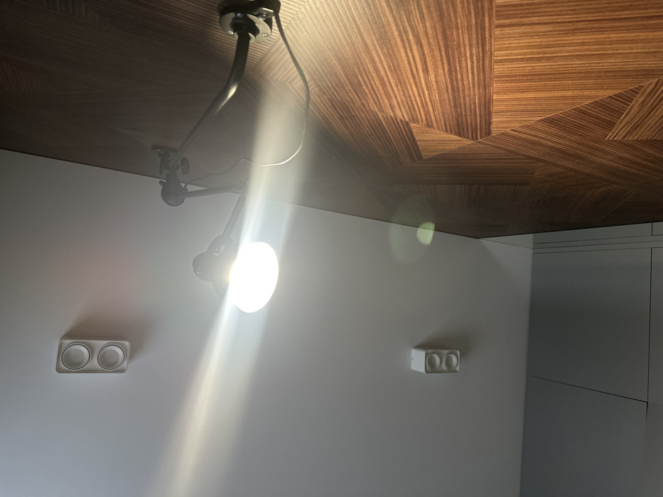 This image depicts an interior scene in Hrodna, Belarus, captured from a low angle looking upwards towards a corner. A wall on the right is covered in a dark brown wood veneer featuring a distinct geometric or chevron pattern, formed by segments of wood grain oriented in various directions. Mounted on this wooden wall, towards the upper right, is a black or dark-colored articulating wall lamp with a fully illuminated bulb, emitting a strong white light and an intense lens flare that extends across the upper-left quadrant of the frame. The adjacent wall, meeting the wooden wall at an acute angle and extending to the left, is a plain light gray or white. On this plain surface, two identical rectangular white fixtures are vertically aligned, each containing two circular recesses or lenses, suggesting recessed lighting elements. The fixture higher up is partially obscured by the lamp's light. At the bottom left, a section of a flat, light gray surface, possibly a lower wall panel or furniture, is visible. No individuals are present.