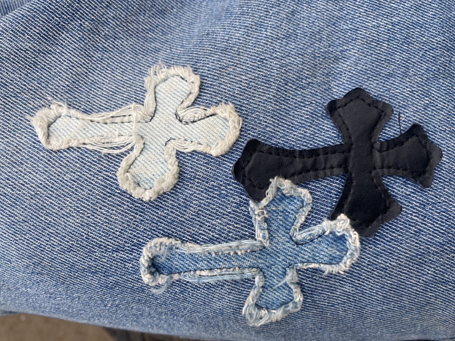 The image displays a close-up view of light blue denim fabric, likely an item of clothing, located in Thika Township ward, Kenya. Three inverted cross-shaped patches are affixed to the denim. The upper two patches are constructed from a lighter shade of denim with frayed, light-colored raw edges. The lower patch is solid black, appearing to be made of a smooth material such as faux leather, with neatly stitched edges. The patches are arranged in a staggered triangular cluster on the denim surface. No individuals, explicit actions, or additional environmental details are discernible in the frame.