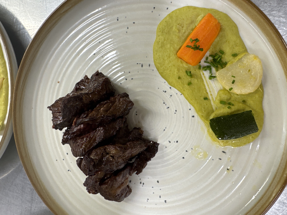 A close-up, overhead photograph depicts a single serving of prepared food presented on a round, off-white ceramic plate with a light brown rim and subtle concentric ridges, potentially in the city of Hoenheim, France. The upper-left portion of the plate holds a cluster of approximately eight dark brown, irregularly shaped pieces of seared or braised meat. The lower-right portion features a teardrop-shaped smear of light green puree or sauce. Arranged on this puree are one rectangular dark green zucchini slice, one pale yellow, roughly half-moon-shaped vegetable slice, and one bright orange, rectangular carrot piece. Freshly chopped green chives are sprinkled over the puree and vegetables. Small, dark specks, possibly ground pepper or other seasoning, are scattered on the plate's white surface. The background is blurred, revealing a metallic surface consistent with a stainless steel countertop or table, and the edge of another white plate with green contents is visible at the top. No people, active interactions, or specific actions are depicted.