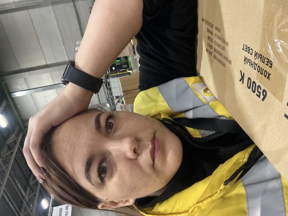 A female subject is depicted in a close-up, upward-angled portrait shot within a warehouse or industrial facility in Zaramen'e, Russia. The subject, appearing to be in her 20s or 30s, has brown hair, brown eyes, and a neutral to pensive expression, looking directly at the camera. She wears a black long-sleeved garment, possibly a turtleneck, under a bright yellow safety vest with gray reflective stripes and a zippered front. A black smartwatch is visible on her left wrist. Her left hand rests on her forehead, and her right arm or shoulder leans against a large, light brown cardboard box positioned in the lower right foreground. The box features Russian text, including "6500 K" and "ХОЛОДНЫЙ БЕЛЫЙ СВЕТ" (COLD WHITE LIGHT), suggesting its contents are related to lighting. The background displays typical warehouse architecture: high ceilings with exposed metal trusses, industrial lighting fixtures, grey paneling, and indistinct stacked boxes and equipment in the mid-ground. A white label with "03 59" is partially visible on an overhead structure in the upper left.