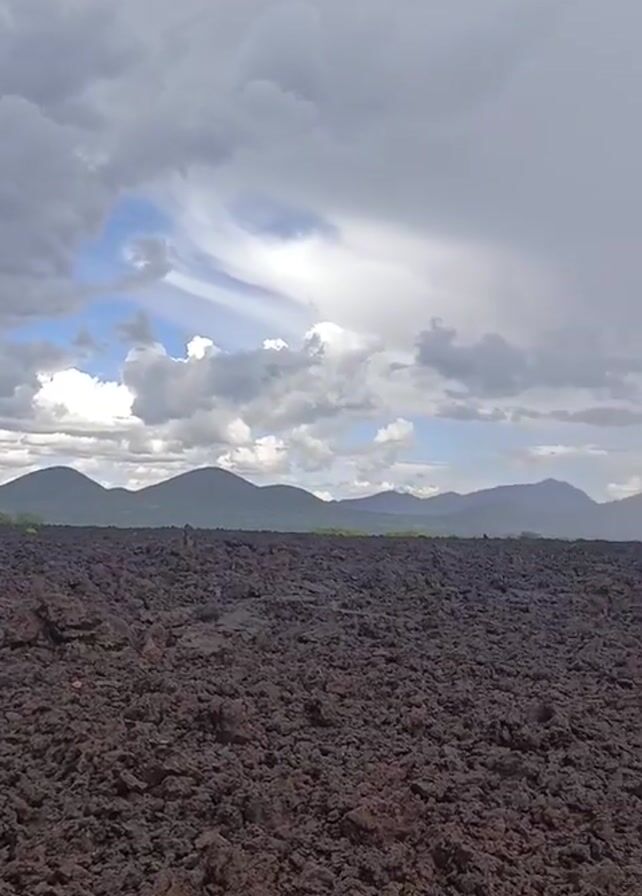 The video depicts a broad, flat landscape composed of dark, rocky terrain, likely cooled lava. In the distance, a range of hills is visible, with a strip of green vegetation along the horizon, separating the rocky ground from the hills. The sky is filled with a mixture of gray and white clouds, partially obscuring a patch of blue sky. The camera pans slightly, offering a wider view of the expanse of lava rock and the sky above.