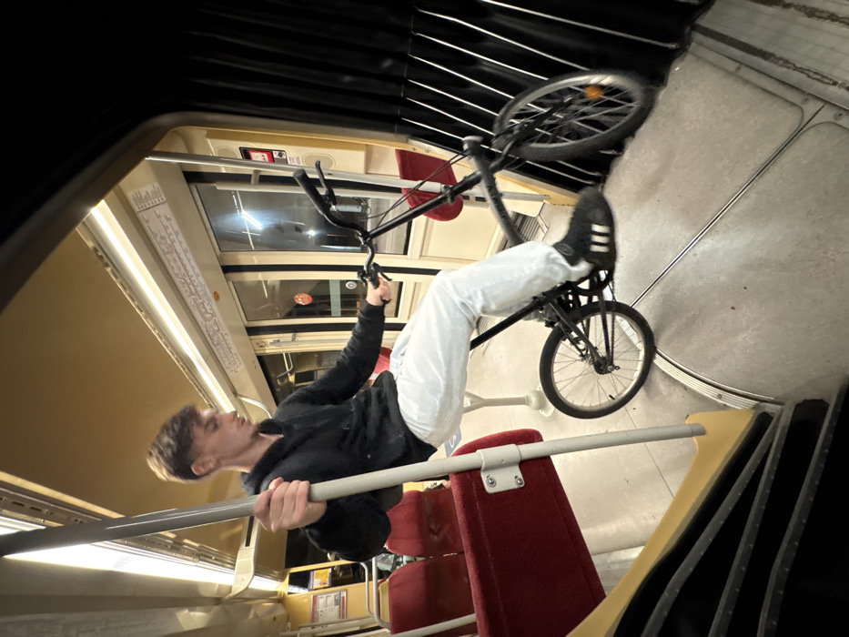 - "Inside a Strasbourg tramway vehicle, operating in Hœnheim, France, a young male is depicted seated on a small black BMX-style bicycle" by FM-Az2kA2, licensed under CC BY 4.0