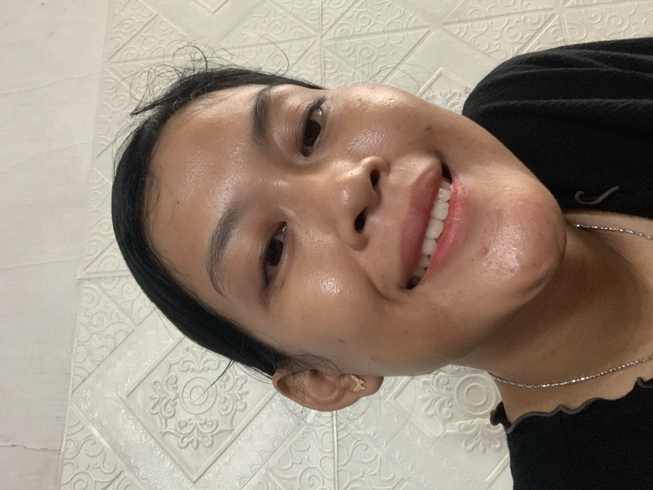 A woman smiles at the camera with a warm, genuine expression. Her dark hair is pulled back, highlighting her smooth, slightly dewy skin. She wears a simple black top with a scalloped edge and a delicate silver necklace. Her teeth are bright white and even. The background is a textured white wall with a geometric pattern. The overall lighting is soft and flattering.