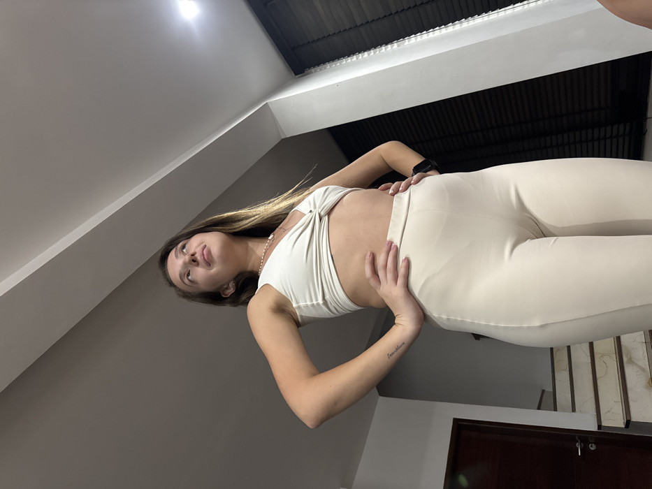 This indoor scene, set in Kerobokan, Indonesia, captures a single female subject from a low-angle perspective. The female, a young adult with light brown hair, stands centrally with both hands positioned on her hips, looking upwards and slightly to her right. She is attired in a light-colored, sleeveless crop top featuring a twisted knot detail at the front and matching high-waisted, form-fitting trousers. A faint tattoo is visible on her left forearm, and a dark-colored digital watch or fitness tracker is worn on her right wrist. A delicate necklace is present around her neck. The background on the left side of the frame features a dark wooden door with a silver handle, situated adjacent to a multi-tiered staircase constructed with light-colored steps and dark risers. On the right side, a window is visible, obscured by closed dark horizontal blinds. The walls and ceiling are painted a light neutral color, with a distinct diagonal architectural line traversing the upper ceiling. Artificial illumination is present, indicating an interior setting.