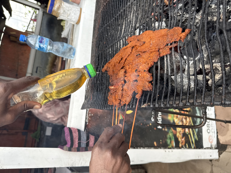 The image captures a close-up, high-angle view of a street food vendor preparing suya (spicy grilled meat) on a charcoal grill in Ado, Nigeria