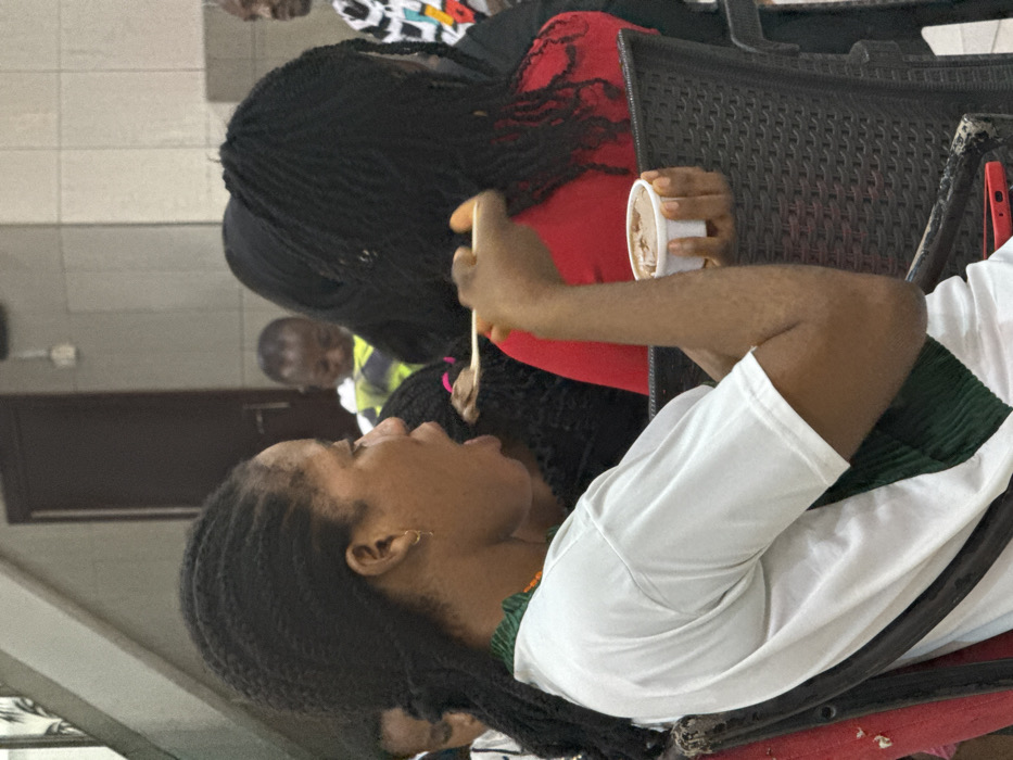 A side view shows a woman with long, dark braided hair eating from a white cup with a spoon. She wears a white and green shirt and is seated in a chair. Behind her, another woman with long, dark braided hair is wearing a red shirt. In the background, a man is partially visible with a yellow and green shirt. A black woven chair and a red object are also visible. The scene appears to be indoors with a tiled wall and a door in the background.