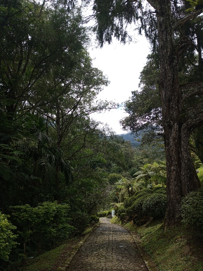 A cobblestone path winds through a dense forest. Lush greenery, including ferns and various trees, engulfs the path on both sides, creating a tunnel-like effect. The trees tower overhead, their branches intertwining to form a canopy, filtering the sunlight. A mountain is visible in the distance, partially obscured by mist or clouds. The overall scene evokes a sense of tranquility and natural beauty.