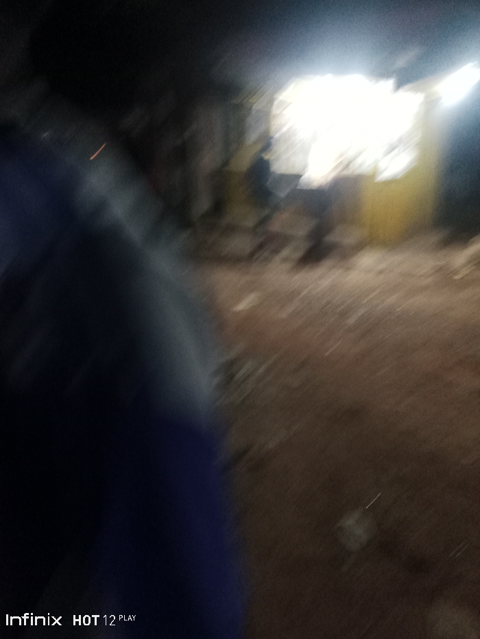 A blurred image shows a dimly lit interior. A bright doorway or window is visible in the background, revealing a yellow or light-colored wall. Several objects that look like crates are in the middle ground. The foreground features a dark, indistinct object, possibly clothing, obscuring a portion of the scene. The overall image lacks sharpness and clarity. The bottom left corner has some writing on it.