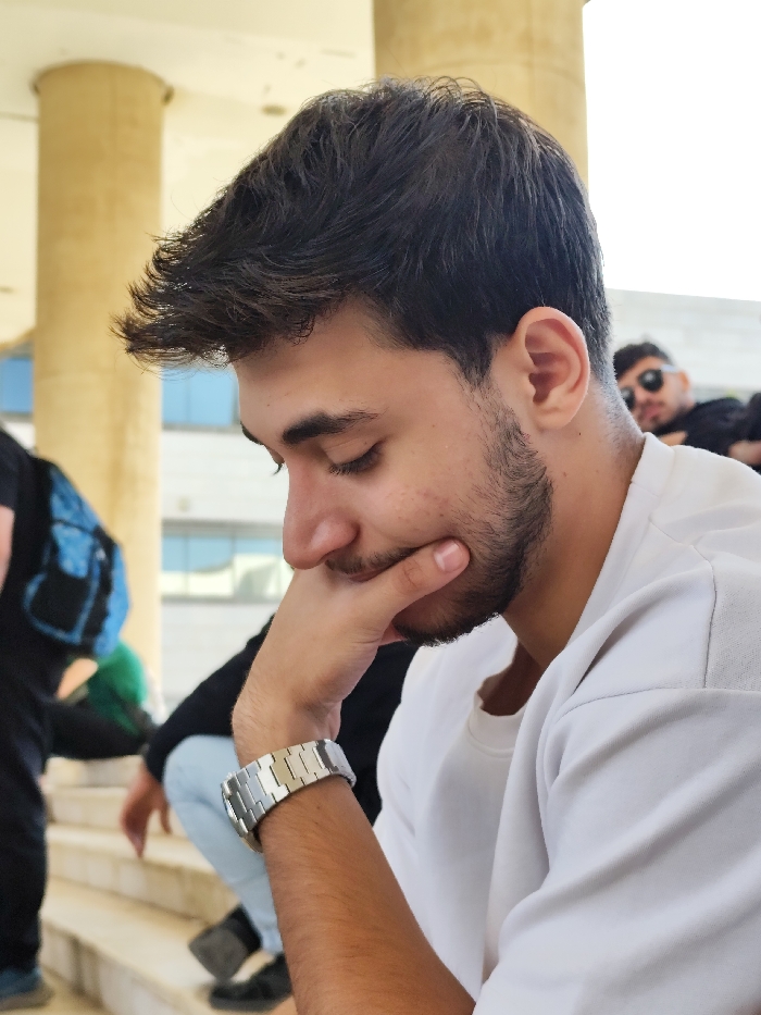 The scene is situated in the city of Jibb as-Safa, Syria. The primary subject is a young male, positioned in a right-facing profile view. He possesses dark, wavy hair and light facial stubble, and is wearing a white short-sleeved top. His left hand is raised, with fingers resting against his chin and lower mouth area, partially obscuring his face. A silver-toned metal watch with rectangular links is visible on his left wrist. His eyes are closed or cast downwards. In the mid-ground to the left, a partially visible individual wearing a dark top with blue and black patterns is seated on light-colored steps. Further in the background to the right, a second male is visible, out of focus, wearing sunglasses and a dark shirt, with his head tilted back. The environment features light-colored architectural columns and a stone staircase. Distant, out-of-focus modern building windows reflecting a blue sky are discernible in the far background. The individuals appear to be in a public or semi-public outdoor setting, possibly a campus or an open-air building area.