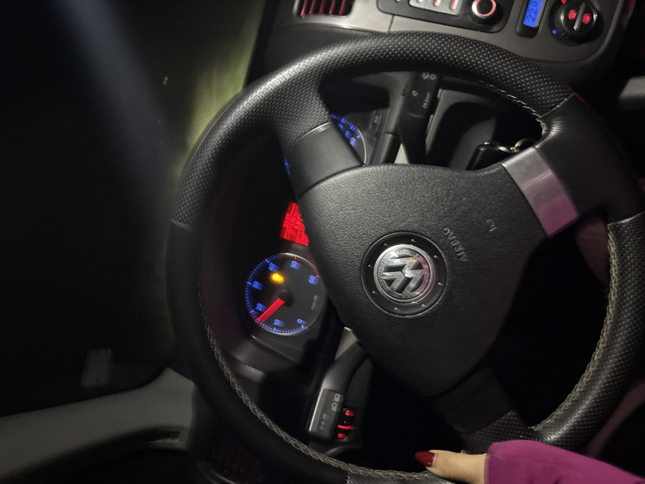 The image depicts the interior of a Volkswagen vehicle at night. A human left hand, adorned with red nail polish and partially clad in a magenta long-sleeved garment, is positioned on the top-left portion of the black, textured steering wheel, which features a central Volkswagen emblem and "AIRBAG" inscription. A grey and white stitched cover is present on the upper left rim of the steering wheel. The dashboard instrument cluster is illuminated, with a tachometer indicating approximately 2000 RPM and a yellow warning light, consistent with a transmission or engine malfunction indicator, illuminated. Additional red warning lights are active on the left side of the dashboard. To the right, a climate control display shows "22.0". Control stalks are visible behind the steering wheel. The exterior visible through the windshield is dark, with a beam of light projecting forward, suggesting headlights are active in an unlit environment. No external visual cues are present to identify a specific location within the city of Batoshevo, Bulgaria.