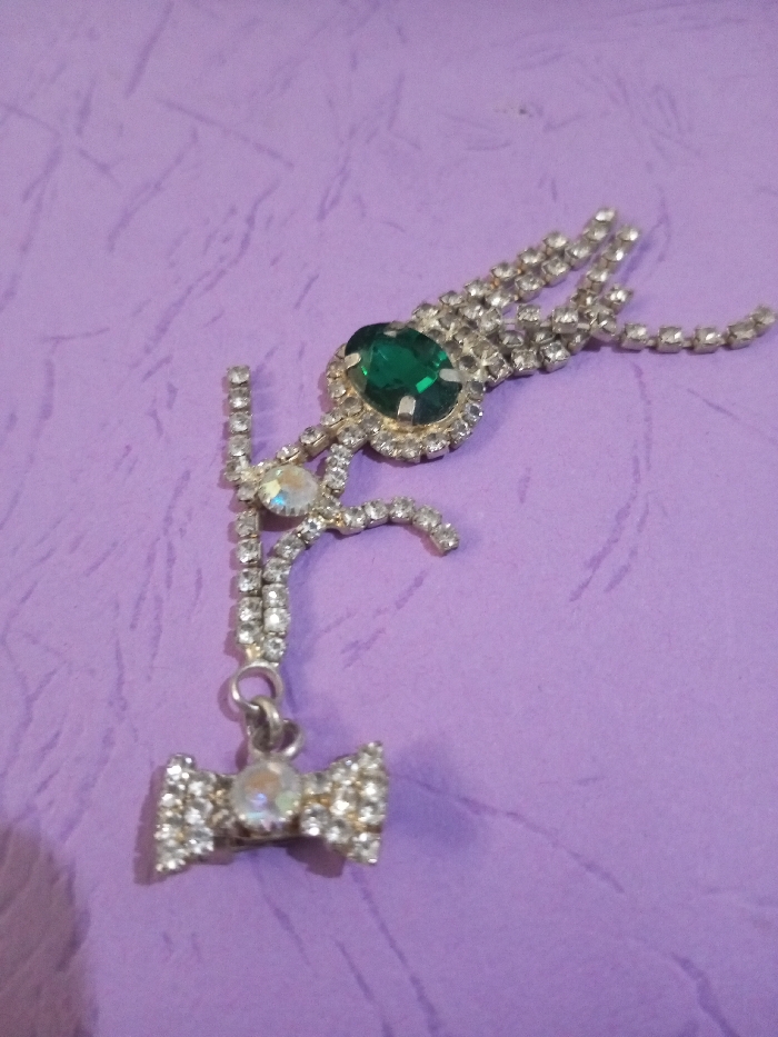 The image displays a single piece of silver-toned costume jewelry, heavily encrusted with numerous clear rhinestones, presented against a light lavender-colored surface that exhibits a subtle, irregular texture. The jewelry item features a prominent oval, faceted emerald-green stone, approximately 1.5 cm in length, positioned centrally towards the upper right, encircled by a halo of smaller clear rhinestones. Multiple short strands of clear rhinestones extend from the green stone towards the upper right. A curved, stylized element, also encrusted with clear rhinestones, extends from beneath the green stone towards the lower left. This element incorporates a larger, iridescent round rhinestone midway along its length. Attached to the lower end of this stylized element by a small silver-toned jump ring is a bow-shaped dangle, approximately 2 cm in width, which is also covered in clear rhinestones and features a central, larger, iridescent round rhinestone. No individuals or specific actions are depicted. The scene is located in the city of Chandragiri, Nepal.