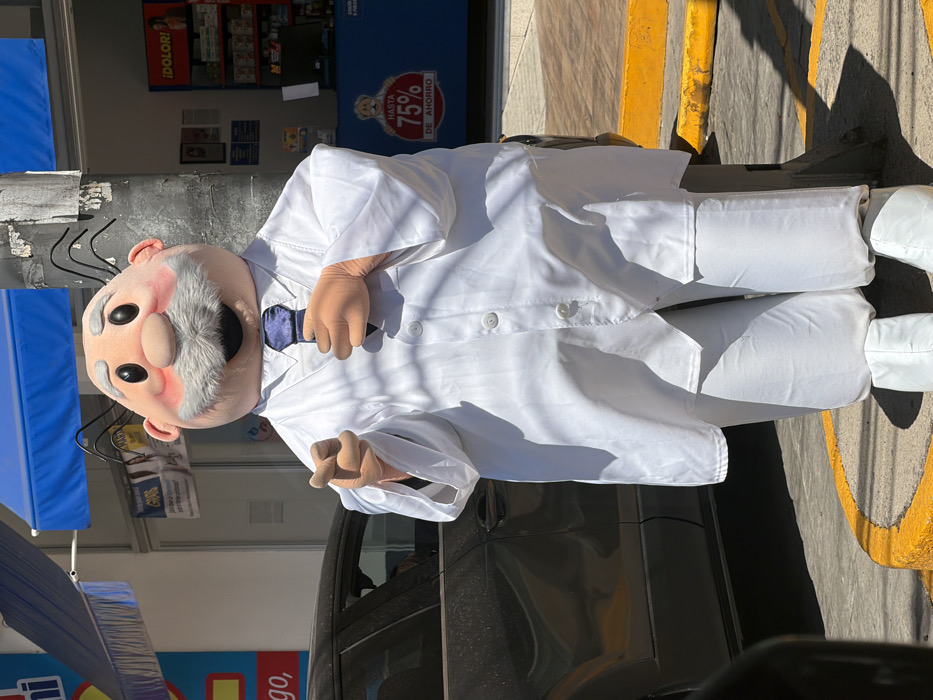 A mascot, dressed as an elderly scientist in a white lab coat, gray mustache, and oversized black eyes, stands in front of a store