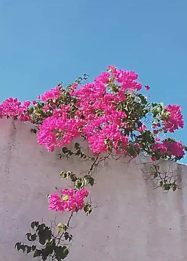 The camera looks up at a white, textured wall, with pink bougainvillea flowers spilling over the top. The blue sky is visible behind the flowers. A few leaves dangle below. The camera is steady.