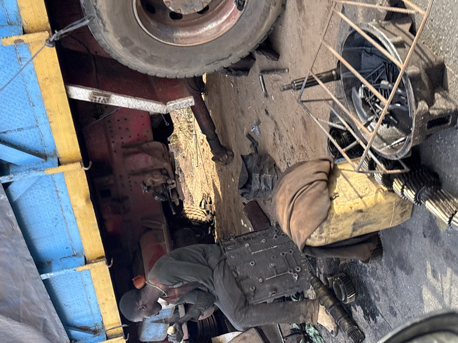 A person works beneath a large truck, concentrating on a dark, rectangular object, possibly a component being repaired. The truck's undercarriage is visible, with a large tire overhead. Adjacent to the worker and the component are other mechanical parts, including a gearbox housed within a metal frame, additional gears, and tools scattered on the ground. The surrounding area is dusty, suggesting an outdoor repair site.