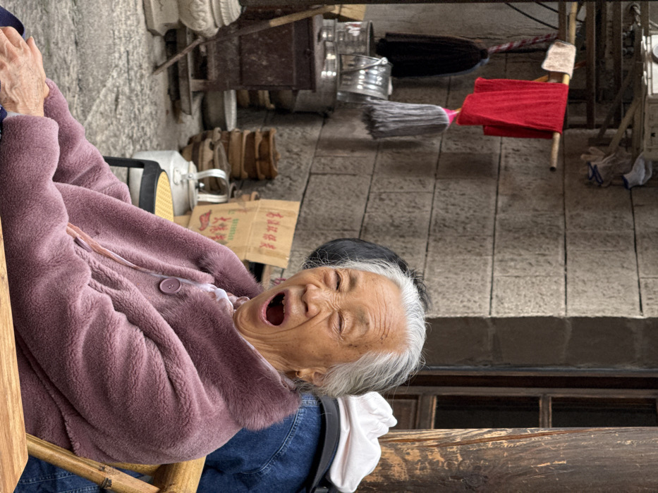 An elderly Asian woman sits, yawning widely, in a chair. She has gray hair and wears a pink sweater over a denim jacket. Behind her, a street scene unfolds with various household items like buckets, brooms, and a red cloth draped over a chair. A cardboard box with Asian characters on it sits nearby. The setting suggests a narrow street or alleyway in an urban area, potentially in Asia.