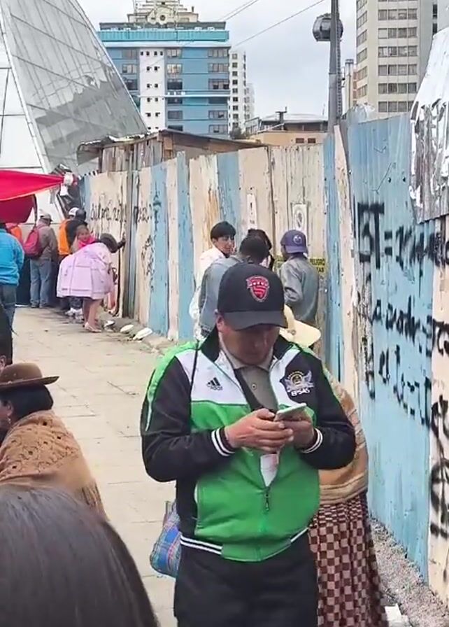 street scene in Bolivia with many people walking. The people are wearing a mix of modern and traditional clothing. A man wearing a green jacket and baseball cap is looking at his phone. A woman wearing a brown shawl and checkerboard skirt is standing nearby. There is graffiti on the walls and a cable car in the distance. The camera moves through the crowd.