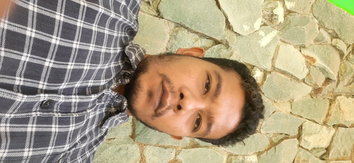 A man with dark hair and a beard poses in front of a stone wall. He wears a gray and white plaid button-down shirt. The wall consists of light green and gray stones of varying sizes and shapes. Green foliage is visible in the upper right corner. The photo is taken at a slightly low angle.