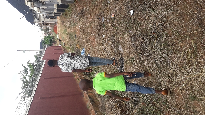 The scene depicts two individuals walking along an unpaved dirt path in Ogbirnike, Nigeria, under an overcast sky. In the foreground, a young male, appearing to be a child, walks away from the camera. He wears a bright lime green polo shirt with yellow trim, blue jeans, and brown sandals, holding a dark rectangular object in his right hand. Ahead of him, an older male, also viewed from behind, walks in the same direction. He wears a light-colored short-sleeved collared shirt with a dark abstract or floral pattern, light blue jeans, and brown sandals. The path is covered with dry grass, weeds, and scattered litter including plastic wrappers and miscellaneous debris. To the immediate left of the path, a tall reddish-brown concrete wall topped with razor wire runs parallel to the path. Green foliage is visible beyond this wall. To the right of the path, a series of decorative concrete pillars, possibly part of a fence, stand, leading to a visible building under construction with exposed concrete framework and scaffolding. A black streetlamp is positioned on the right side of the path. A utility pole with overhead lines is visible further down the path on the left. The general environment suggests a residential or developing urban area with ongoing construction and varied levels of maintenance.