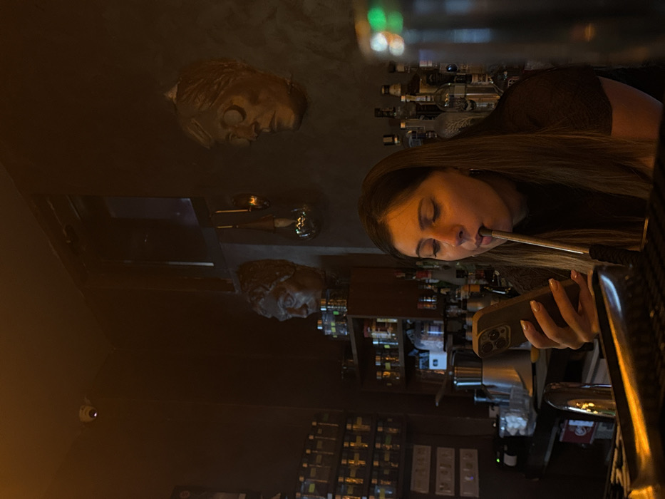 An indoor commercial establishment, identifiable as a bar or lounge, is depicted in Sofia, Bulgaria. The scene is dimly lit. A single female individual, appearing to be in her mid-20s to early 30s, with long brown hair and wearing a dark top, is positioned behind a counter. She holds a light-colored smartphone (consistent with an iPhone 14 Pro or 15 Pro) in her left hand, viewing its screen. Simultaneously, she holds a metallic hookah mouthpiece in her mouth, indicating active use of a hookah. Her right arm rests on the counter. The background on the left features a wall with multiple shelves holding numerous small, uniform glass jars or containers, suggesting spices, teas, or cocktail ingredients. A security camera with a red indicator light is mounted on the upper left ceiling, and a dark, recessed opening or window is visible on the upper wall. The background on the right displays a bar setup with tiered shelving holding various bottles of spirits. Two distinct, stylized head busts are mounted on the dark wall. The bust on the left represents a classical, draped figure. The bust on the right is a smoother, metallic-toned, modern-stylized male head with hollowed eyes. Partial bar equipment is visible on the counter. The immediate foreground shows parts of the bar counter and metallic bar tools, including what appears to be tongs.