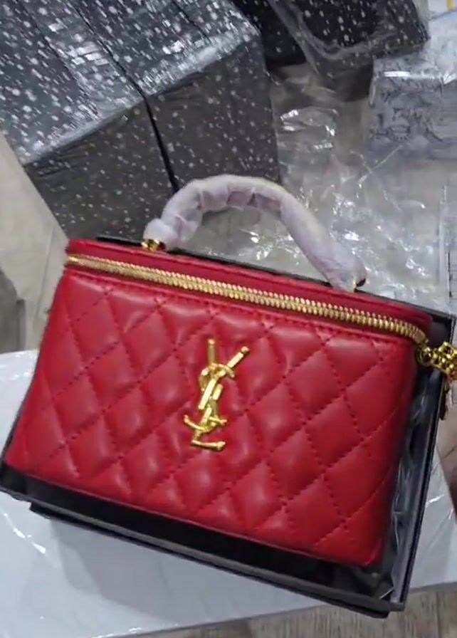 collection of luxury makeup bags and their packaging. The bags are displayed on a floor alongside several wrapped boxes. The main focus is on two YSL bags, one red and one black, both quilted with gold hardware. Other visible packaging includes that of Dior products. A person's foot is seen in the corner of the frame, indicating someone is present and likely arranging or showcasing the items. The background and overall scene suggest a retail or storage environment.