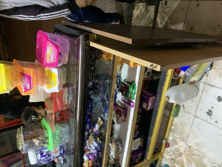 A small shop displays a variety of snacks and sweets. Clear plastic containers filled with colorful candies are stacked on the left. A reflective metal frame holds up the display. Shelves behind this frame are packed with individual packages of cookies, candies, and other treats. Two wooden planks serve as countertops. A young child wearing a green shirt is visible on the left, seemingly interacting with the display. The floor is tiled and shows signs of wear. A large plastic water jug is situated on the right.