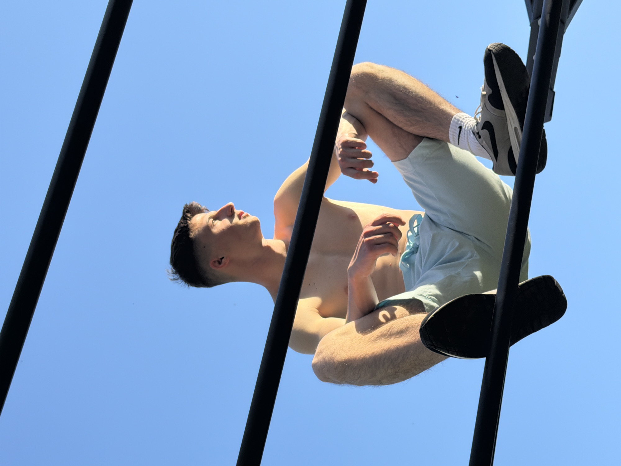 A low-angle shot captures a person suspended upside down, appearing to be performing a gymnastic or acrobatic maneuver on a set of parallel bars. The individual is a young male with a fair complexion and short, dark hair. He is shirtless, wearing light blue shorts, white socks, and athletic shoes with gray and black detailing. His arms are positioned holding onto the bars for support, and his gaze is directed upward. The bars are black and contrast against a clear, bright blue sky. The photograph was likely taken outdoors on a sunny day, with the perspective emphasizing the subject's elevated and inverted position. The location of the photo is Burgas, Bulgaria.