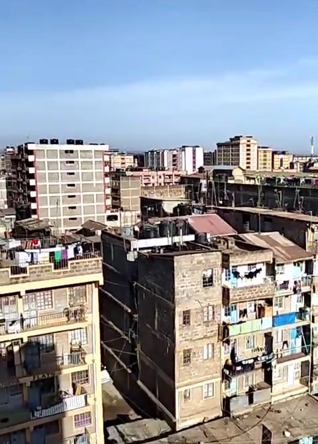 n urban cityscape under a clear blue sky. The scene is dominated by densely packed buildings of varying heights and architectural styles, mostly residential. The buildings exhibit a mix of materials and finishes, with some appearing relatively modern and well-maintained, while others show signs of age and wear. Many rooftops are visible, some adorned with water tanks, antennas, and laundry lines strung with colorful clothing. The overall impression is one of a bustling, high-density urban environment. The video pans slowly.