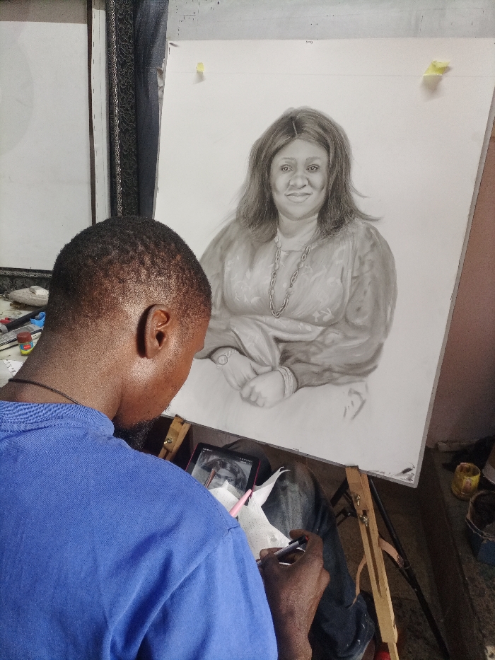 This image depicts an artist at work within a studio setting in Jos, Nigeria. A male individual, observed from an elevated perspective over his left shoulder, is engaged in creating a large-scale portrait. He has short dark hair, dark skin, and wears a blue t-shirt over dark trousers. His right hand is actively manipulating a dark drawing implement, likely a pencil or charcoal stick, along with a white blending stump. Positioned directly in front of him on a wooden easel is a large white sheet of paper bearing a highly detailed, realistic monochrome portrait of a smiling woman. The woman in the drawing has medium-length dark hair, wears a patterned blouse, a long chain necklace, and has her hands clasped. Below the drawing and slightly to the artist's left, a tablet displays a photographic reference image. The immediate background to the left reveals a cluttered workbench with various art supplies including paint containers, brushes, and other tools, next to a dark, possibly decorative, curtain against a light wall. The overall scene suggests an active art production space.