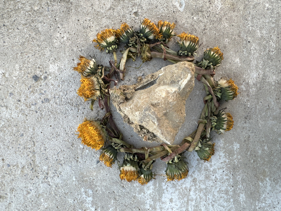 An overhead photograph displays a precise arrangement of organic and inorganic material on a light grey concrete surface, located in Gif-sur-Yvette, France. Approximately twenty withered dandelion heads and stems are meticulously arranged to form an irregular circle, with an approximate outer diameter of 30 cm. The dandelion florets are faded yellow to orange, and their stems range in color from green to reddish-brown. Centrally positioned within this floral circle is a single, irregularly shaped rock, predominantly light brown and grey, measuring approximately 15 cm at its widest point. The rock exhibits some adhering soil and fragmented debris on its upper surface. The concrete background shows a uniform light grey coloration with minor textural variations and scattered small dark specks. No human subjects are present.