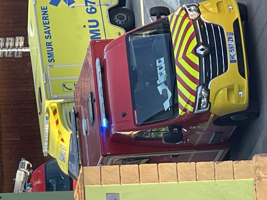 The image depicts a static scene in Saverne, France, featuring three emergency response vehicles
