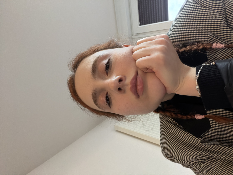 An individual is depicted indoors in Eschau, France, captured from a low-angle perspective. The subject is a person with fair skin and auburn hair styled into two visible braids, one secured with a light pink elastic. They are positioned with their chin resting on their right hand, fingers loosely curled. Their gaze is directed upward towards the camera, and their lips are slightly pursed. The subject wears a dark-colored, possibly black, turtleneck or high-collared garment underneath a patterned blazer. The blazer exhibits a black and white or dark gray and light gray check or houndstooth pattern. A silver-toned bracelet with multiple small charms, including a star-shaped pendant, is visible on their right wrist. The background consists of a plain white ceiling occupying the upper portion of the frame. To the left, a light-colored wall is visible, while to the right, a window or door frame with a dark blind or shutter is present, suggesting an exterior view beyond. The lighting is diffuse and even.