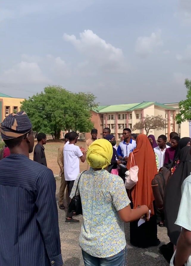 group of people gathered outdoors, likely at an event or meeting. The group is diverse in age and attire, with some individuals wearing traditional clothing and head coverings. There are banners with the name "Awibi" and the phrase "Africa's premier health...technology company" on display. The setting appears to be a campus or institutional ground, indicated by the presence of buildings with a green roof and a well-maintained open space with trees. People are standing around, some engaging in conversations, while others appear to be listening or observing. The overall atmosphere is one of activity and engagement.