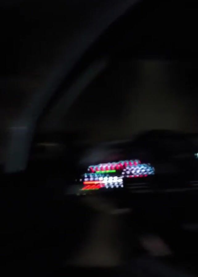 A person with dark hair and a beard is seen sitting in the driver's seat of a car, looking back toward the camera. The car's interior is mostly dark, but the dashboard lights are visible, and a water bottle sits in the center console. The camera then moves to the right, and a hand partially blocks the view.