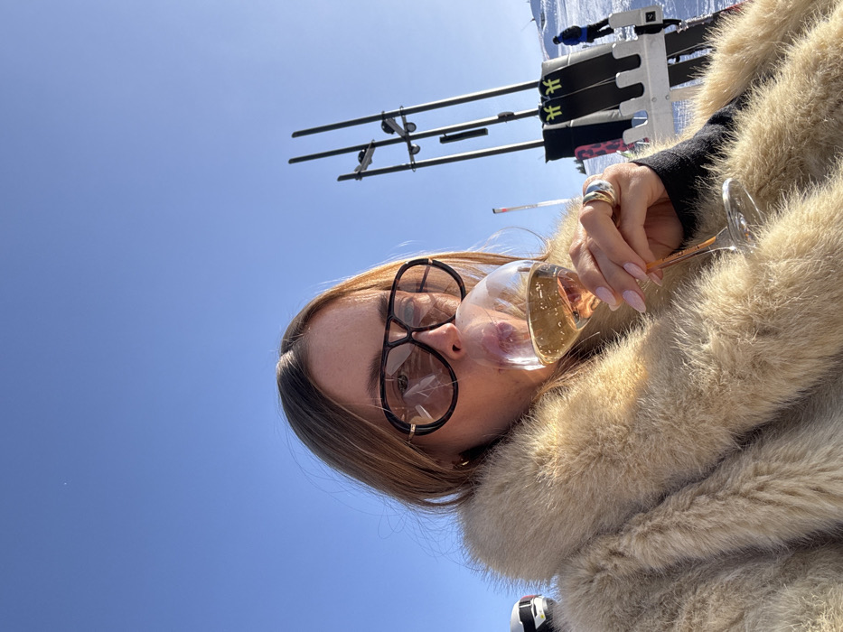 A woman is captured in a close-up, upward-angled selfie at a ski resort in Courchevel, France, under a clear blue sky. She has light brown hair and wears large, dark-rimmed aviator-style sunglasses. Her prominent attire is a plush, light beige faux fur coat over a dark garment. She is holding a stemmed glass filled with a golden sparkling liquid, presumed to be champagne, to her mouth, actively drinking. Her right hand, adorned with light pink manicured fingernails and a metallic ring on the forefinger, supports the glass. In the mid-ground to the right, a black ski rack holds several pairs of skis and a snowboard. The skis feature black and white designs with yellow-green "H F" logos. A snowy slope is visible in the background, with a lone skier dressed in dark attire further down the incline. A white ski helmet with black detailing is partially visible on the far left.