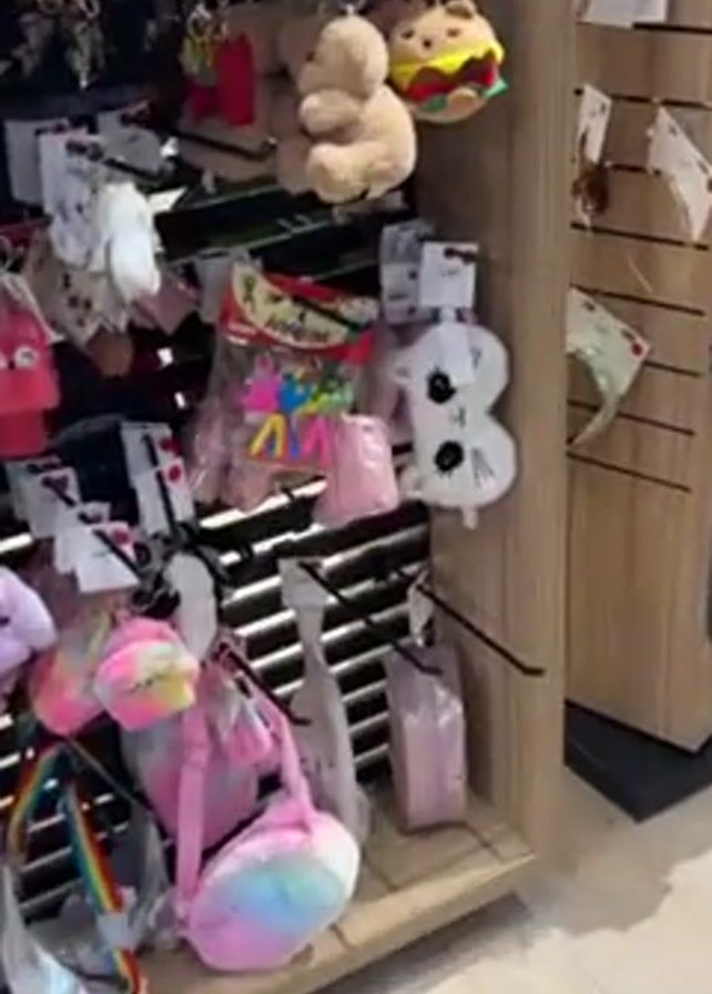 A close-up shot shows a section of a retail display shelf filled with various accessories. The shelf is made of light wood and features narrow horizontal slats. The items on display include keychains, small bags, and hair accessories. Among the keychains are plush toys like a bear and a burger. There is a white, fluffy cat-shaped eye mask. The bags are colorful, with pink, rainbow, and iridescent designs. Price tags are visible on several items. The background includes a partial view of another display shelf with similar items. The floor is light-colored wood.