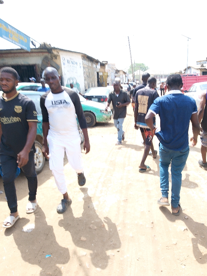 A group of men walk down a dusty street in daylight. Buildings line the street with parked cars. The men wear casual clothes, including t-shirts, jeans, and slides or sandals. Shadows are cast on the ground from the sunlight. One man wears a black and gold soccer jersey. Another wears a white shirt with the letters "USTA". The environment appears to be a typical urban setting with a mix of commercial and residential structures.