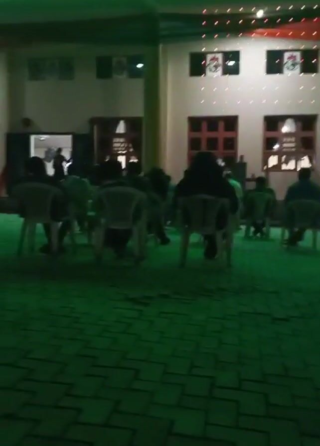 People are sitting in chairs in a paved outdoor area illuminated by green lights. The lights give the paving a bright green cast. There is a building behind the seated people. The building is decorated with colored lights. People walk in and out of the building.