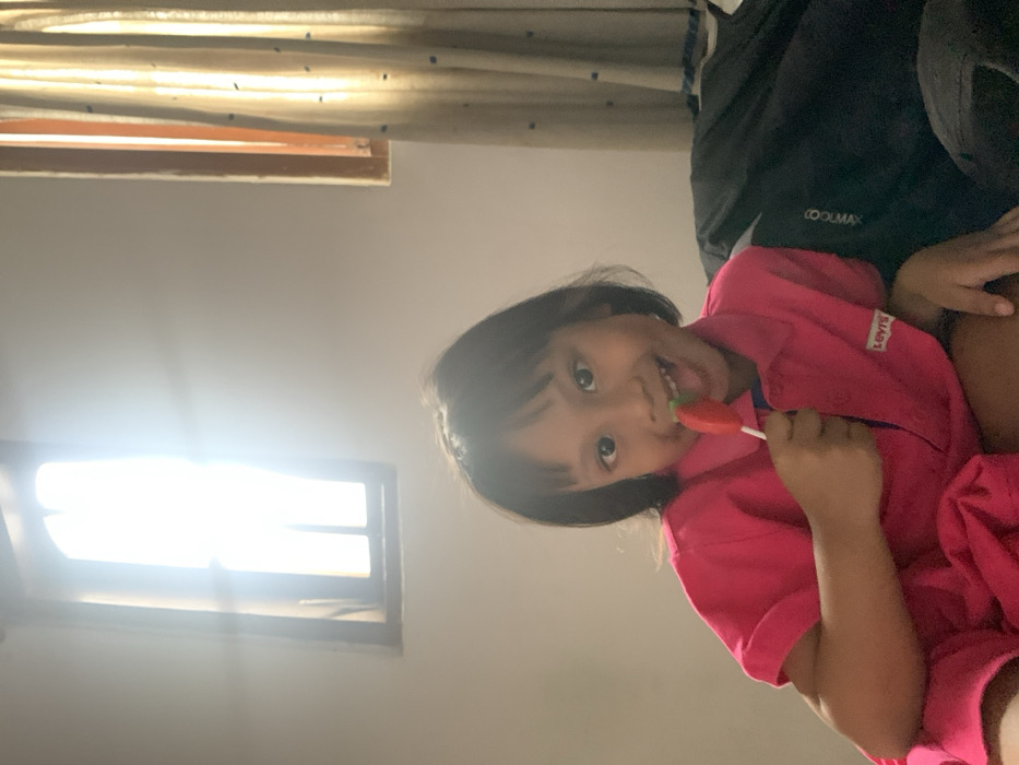 A young girl with short, dark hair wears a bright pink shirt with a Levi's tag. She holds a red, strawberry-shaped lollipop near her mouth and grins at the camera. The bright light from a window illuminates the left side of the frame. The background includes a light-colored wall, curtains near the top, and a dark-colored jacket in the upper right corner.