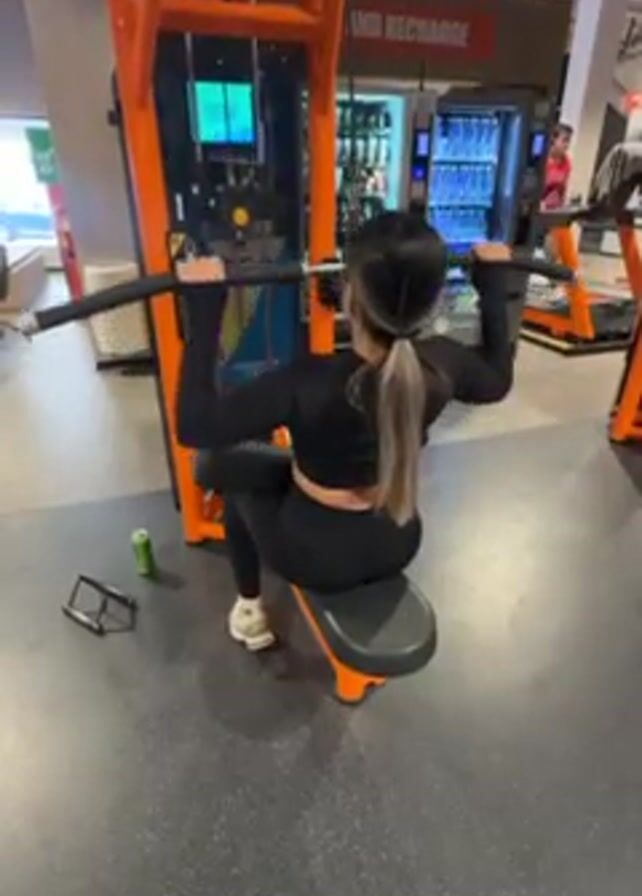 woman performing lat pulldowns in a gym. The gym has orange and gray equipment, and a "Fresh and Recharge" vending machine is visible in the background. The woman is wearing a black workout outfit and white sneakers, and her hair is pulled back in a ponytail. She is seated on the machine, gripping the bar with a wide overhand grip, and pulling the bar down towards her upper chest, keeping her back straight. A green drink can and a handle for the machine are on the floor. Another woman is visible in the background on an exercise machine. The floor is gray with black specks.