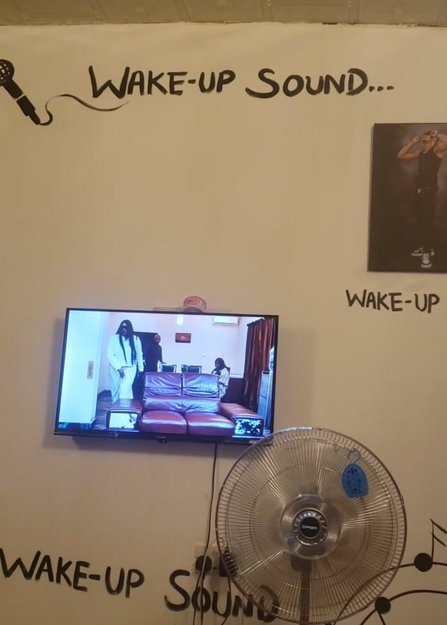 Here's a concise description of the scene: The video shows a wall with the words "WAKE-UP Sound..." written on it, along with a microphone drawing. A portrait hangs above a flat-screen TV, and to the right, there's a standing fan. The TV is displaying a scene, and the wall also has other decorations like musical notes.