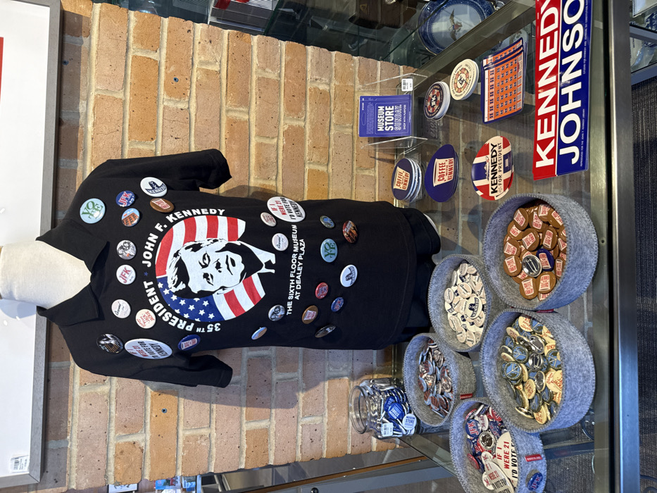 A black collared shirt, displayed on a mannequin, is adorned with various political buttons, centered around a portrait of John F. Kennedy. Buttons promoting Kennedy and Johnson are visible. Adjacent to the shirt, a glass display case holds assorted Kennedy-themed merchandise. This includes buttons organized in gray felt containers, a jar full of blue and white pins, and items like “Coffee Kennedy” mugs. A small sign for the museum store is also present, adding to the museum souvenir display.