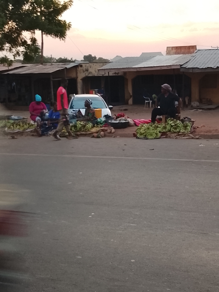 This image captures a roadside market scene in the city of Lafia, Nigeria, during what appears to be dusk or dawn