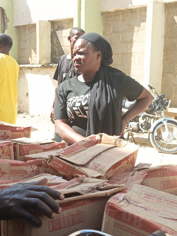 The scene is set in Fagge A, Nigeria, under bright daylight conditions. In the foreground, multiple worn cardboard boxes are stacked, prominently displaying "CHICKEN FLAVOUR SEASONING" labels, "20x50g" and "Net weight 2kg" text, along with barcodes and other alphanumeric codes, suggesting bulk food distribution. A dark-skinned hand rests on one of these boxes. In the midground, a dark-skinned adult female, wearing a black head covering and a black t-shirt with "EXPECT NO ELE" in white text, stands with her left hand on her hip, looking towards the left with a focused expression. Behind her, a dark-skinned adult male in a dark t-shirt is partially visible. To the far left, the back of a dark-skinned adult male in a yellow t-shirt is seen. In the background to the right, a dark-colored motorcycle with silver accents is parked. The environment consists of rough, light-colored block walls of a building and an uneven, dusty ground surface.