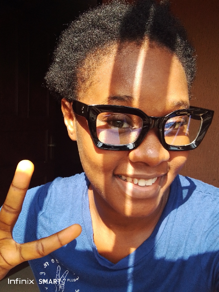 A close-up, chest-up portrait depicts a smiling young adult female with short, dark, tightly coiled hair. She wears black-framed, cat-eye style eyeglasses with clear lenses, revealing brown eyes. Her lips are drawn into a broad smile, exposing white teeth. She is dressed in a blue, textured, short-sleeved t-shirt, with a partial graphic visible on the lower left chest. Her left hand is positioned in the lower left foreground, forming a peace sign with the index and middle fingers extended. The scene is illuminated by harsh, direct sunlight, casting multiple distinct vertical shadow stripes across her face, neck, and torso. The background is out of focus, consisting of a warm, reddish-brown textured surface on the right and a dark, possibly wooden, surface on the left. A digital watermark reading "Infinix SMART 7 plus" is present in the lower left corner of the image. The specific location within the city of Unknown, Unknown cannot be determined.