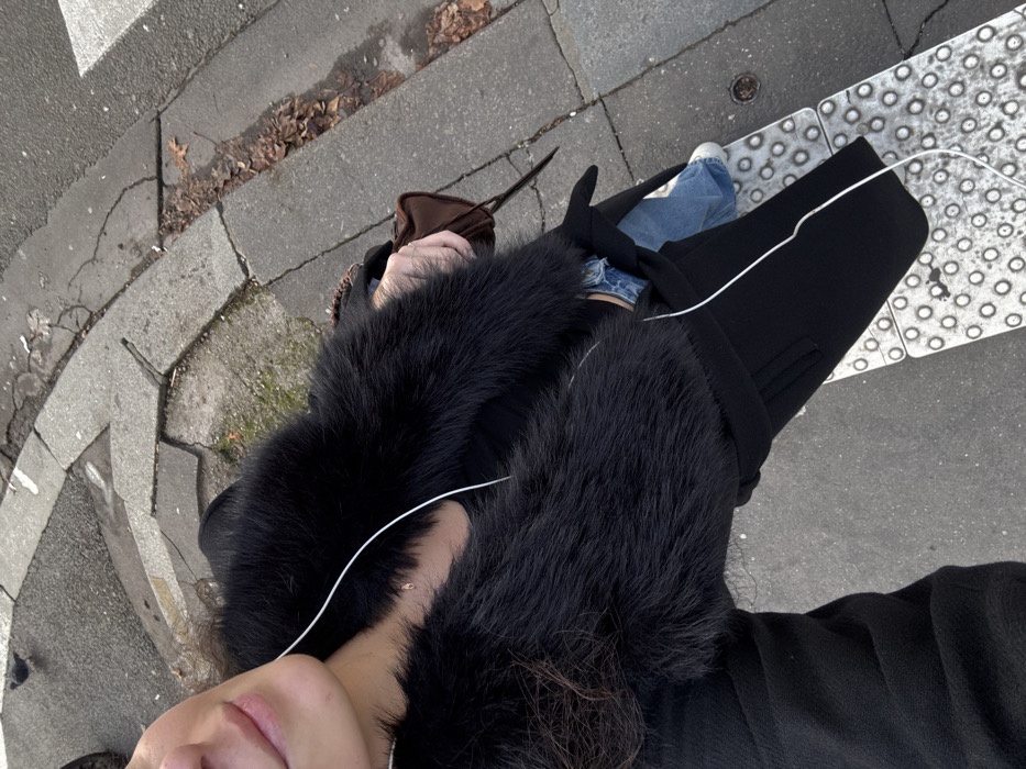 A high-angle, first-person perspective captures a partial view of an individual standing on a Parisian sidewalk. The person is visible from the upper chest down, with a portion of the chin, mouth, and left cheek visible in the upper left quadrant. They wear a black garment with a prominent black faux fur collar, a black coat, blue denim jeans, and white sneakers. White wired earphones are draped across their chest and coat, with a small golden pendant visible on the décolletage. The right hand holds a small brown leather handbag. The environment consists of a grey concrete sidewalk with visible cracks and segmented paving, alongside a darker asphalt street. White tactile paving with truncated domes is present on the sidewalk in the lower right, indicating a pedestrian warning area. Dry brown leaves are scattered along the curb between the sidewalk and the street. The scene is illuminated by natural daylight.