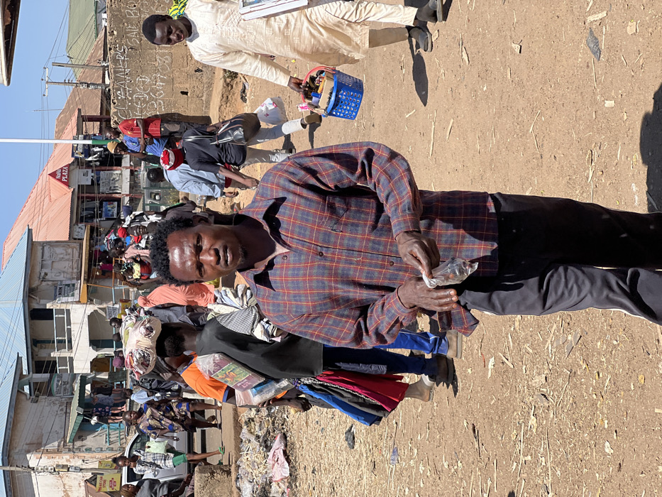The image depicts a bustling outdoor street or market scene in Bukuru, Nigeria, under bright daylight. The ground is unpaved, consisting of reddish-brown dirt with scattered debris. In the immediate foreground, a dark-skinned male, estimated to be in his late 20s or early 30s, stands slightly right of center, looking directly at the camera with a neutral expression. He wears a long-sleeved plaid shirt with red, blue, and black patterns, partially unbuttoned, and dark athletic pants with a white stripe on the side. His hands appear slightly wet or oily, and he holds a small, clear plastic bag containing dark objects in his right hand. Behind the central figure and to his left, several individuals are visible. One person with their back to the camera wears an orange shirt and appears to be a vendor, carrying items on their back, including what look like books or pamphlets. Another person carries a large, wrapped bundle on their head. Further left, a white car is partially visible, and a small pile of refuse is on the ground. To the right of the central figure, a man in a light-colored traditional garment (possibly cream or beige) walks towards the right, carrying a blue plastic basket filled with various items, including bottles, in his left hand. Further into the background on the right, a rough, unpainted wall displays white graffiti, including "CLEANERS SALE BO" and phone numbers. Several people are standing or walking in this area, including one man in a red shirt and another in a light blue shirt. One individual in a black shirt and a red beanie walks away from the camera, carrying a bag over their shoulder. The background features multiple multi-story buildings with various colored roofs (red, blue, white) and balconies. A prominent red sign reading "Naha PLAZA" is visible on one building. The scene indicates active commerce and pedestrian traffic.