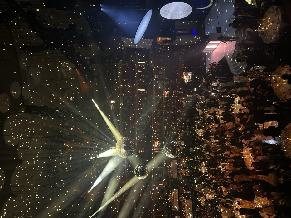 A crowded room with tables and people is lit by disco balls casting sparkling light. Beams shine from the disco balls and other lights from the ceiling. The ceiling has circular lights, including one with a crescent moon and stars. A raised platform with illuminated steps is visible on the right side of the frame. The scene captures a lively atmosphere.