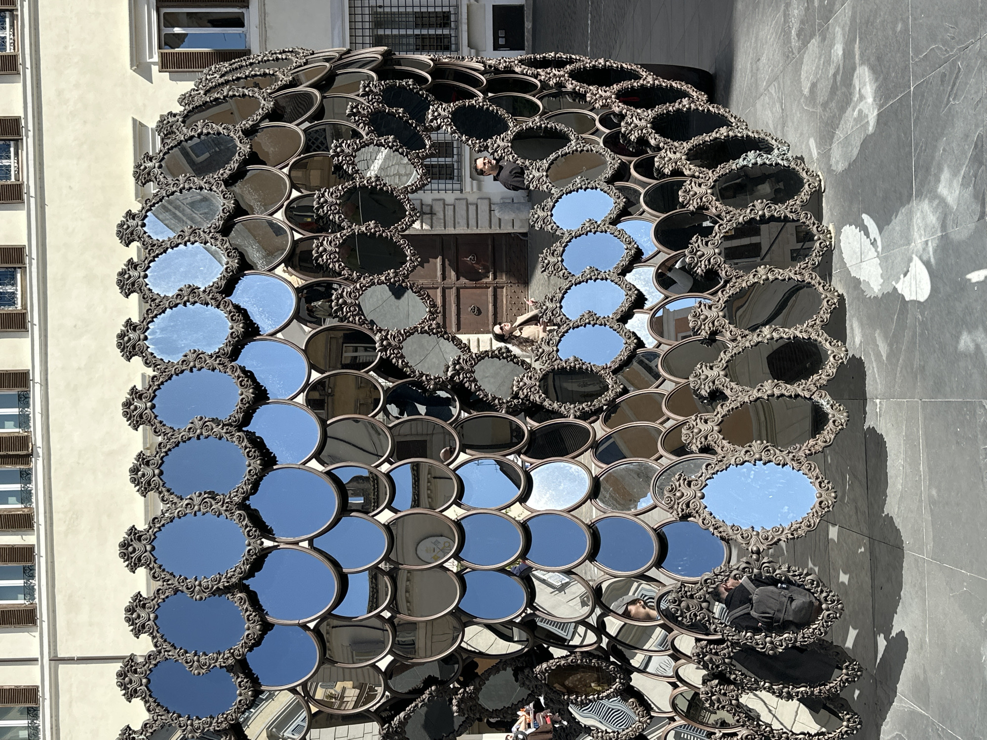 The scene depicts an outdoor art installation situated on a paved square in the city of Rome, Italy, under bright daylight. The central object is a large, curved structure composed of numerous interlocking mirrors. This installation features two types of mirrors: ornate, oval mirrors with dark, decorative antique-style frames, and simpler, circular/oval mirrors with thin frames. They are arranged in an overlapping pattern, forming a segmented, undulating surface with a prominent, irregular opening near its center. Through this central opening, a woman wearing sunglasses and a light-colored jacket is visible, positioned slightly to the viewer's left of the opening's center, looking towards the viewer's right. To her right and slightly behind her stands a man with a dark beard and dark clothing. Reflections of other individuals are visible in various mirrors, including a person wearing a dark backpack reflected in lower mirrors on the left side of the installation. The background consists of light-colored, multi-story buildings with distinct dark wooden window shutters. A dark double door is visible through the installation's opening. The ground is paved with dark gray square tiles, displaying bright sunlight reflections and distinct shadows cast by the mirror structure. A clear blue sky is prominently reflected in many of the upper mirrors.